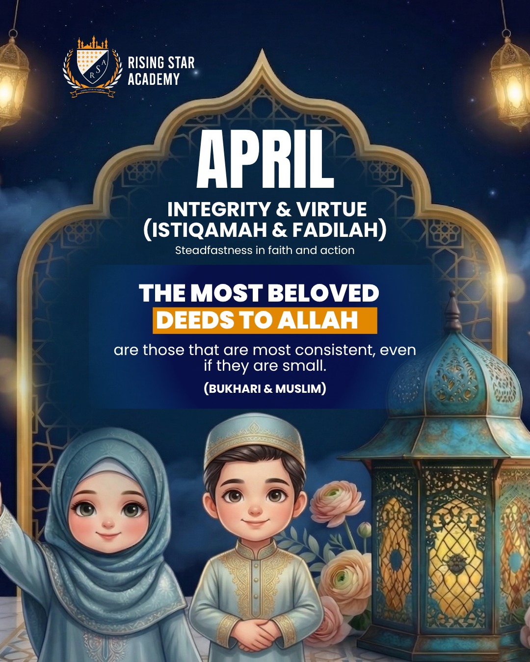 At Rising Star Academy, we are committed to nurturing not only academic excellence but also strong Islamic character. Each month, we highlight a key value that inspires our students to grow in faith, integrity, and responsibility. Through reflection and practice, we strive to make these values part of our daily lives.